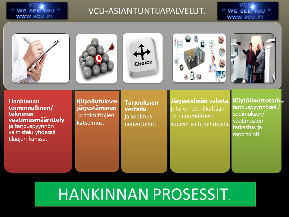 Osaamme auttaa asiakkaitamme e-health, hoiva-/ hoitajakutsu-tekniikaan, videovalvontaan, etäneuvotteluun / videoneuvotteluun ja av-järjestelmiin liittyvissä hankinnoissa, kehittämisessä, koulutuksessa ja muissa prosesseissa.